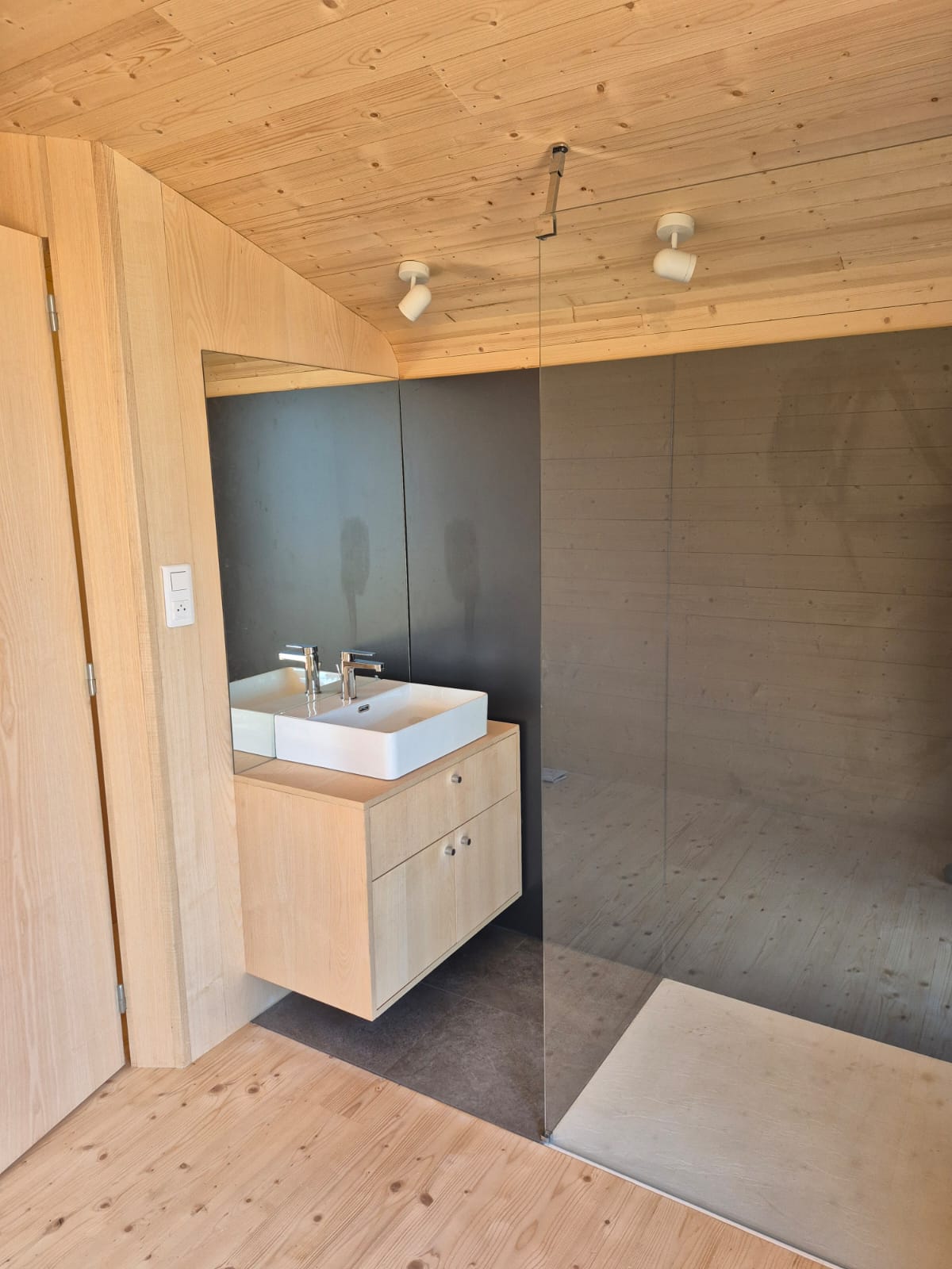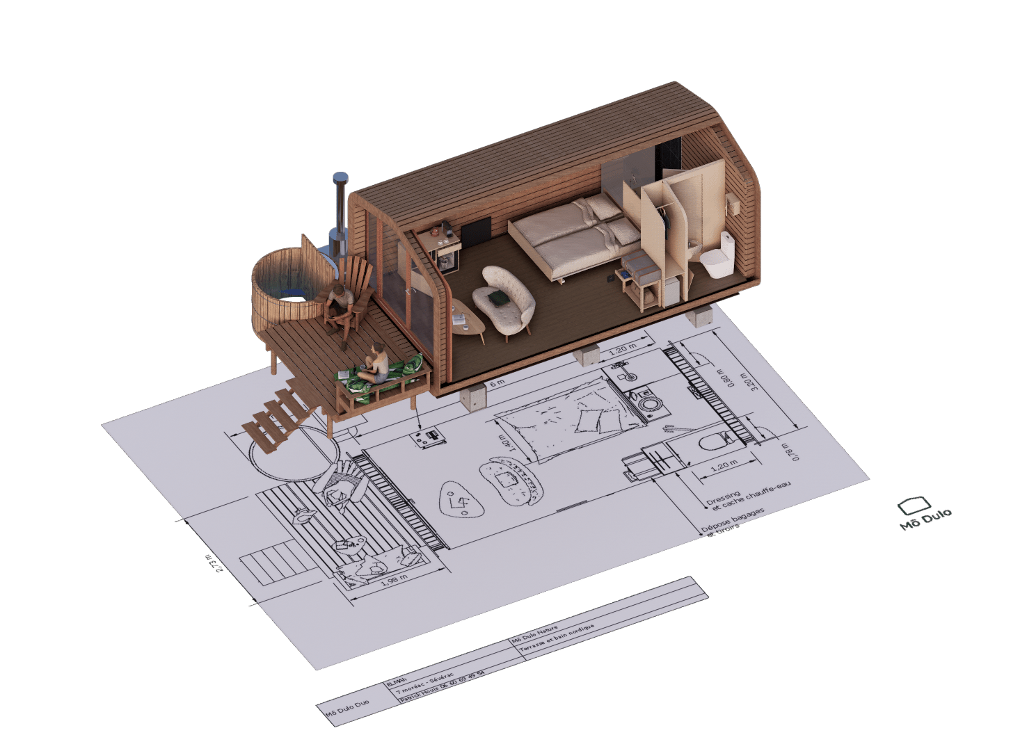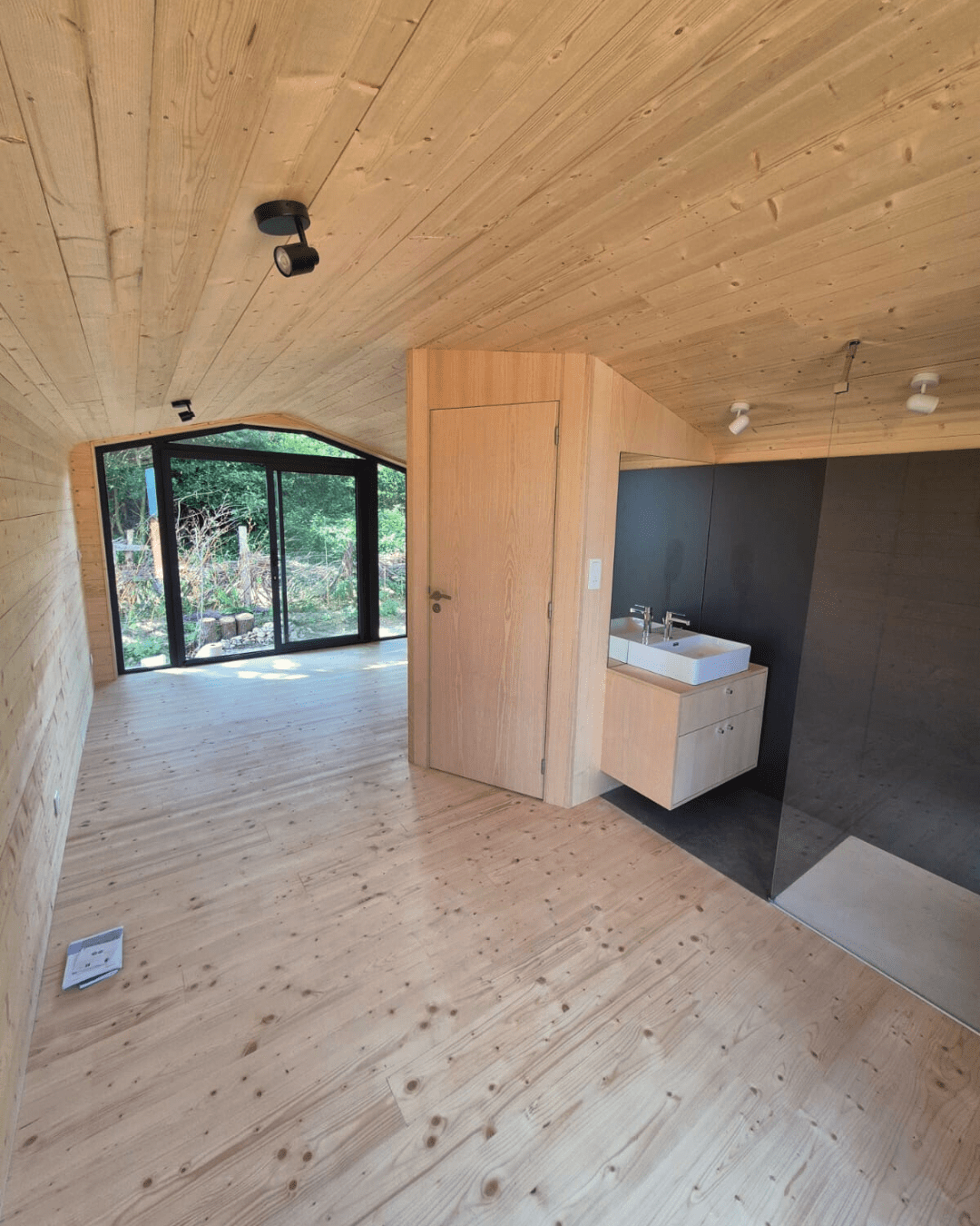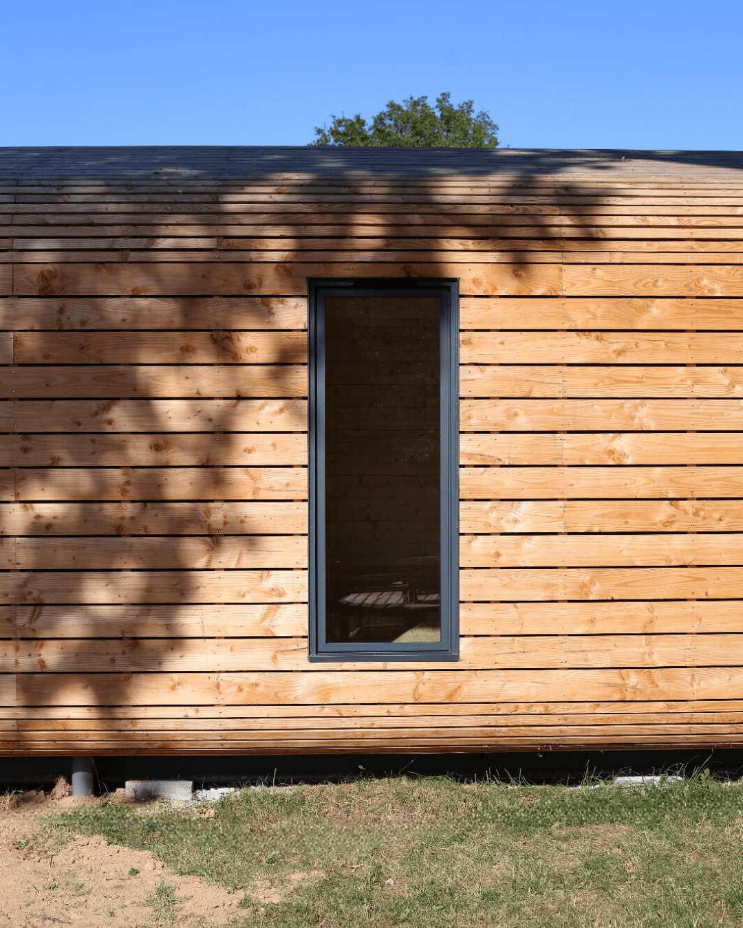 Matériaux : module en Douglas et pin, laine de coton, contreplaqué de frênes pour les aménagements.